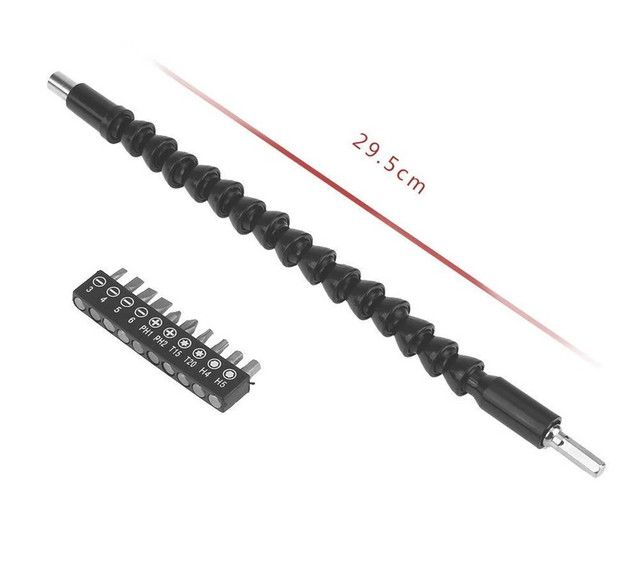 Гибкий переходник с битами Flexible Shaft Extension Bits используется с дрелью или шуруповертом для работы в труднодоступных местах. Бита имеет шестигранный хвостовик для закрепления в патроне инструмента с одной стороны, и цанговый патрон под шестигранные биты с другой стороны. Патрон не имеет зажимов, бита держится в нем за счет магнита. Длина биты составляет 30 см.